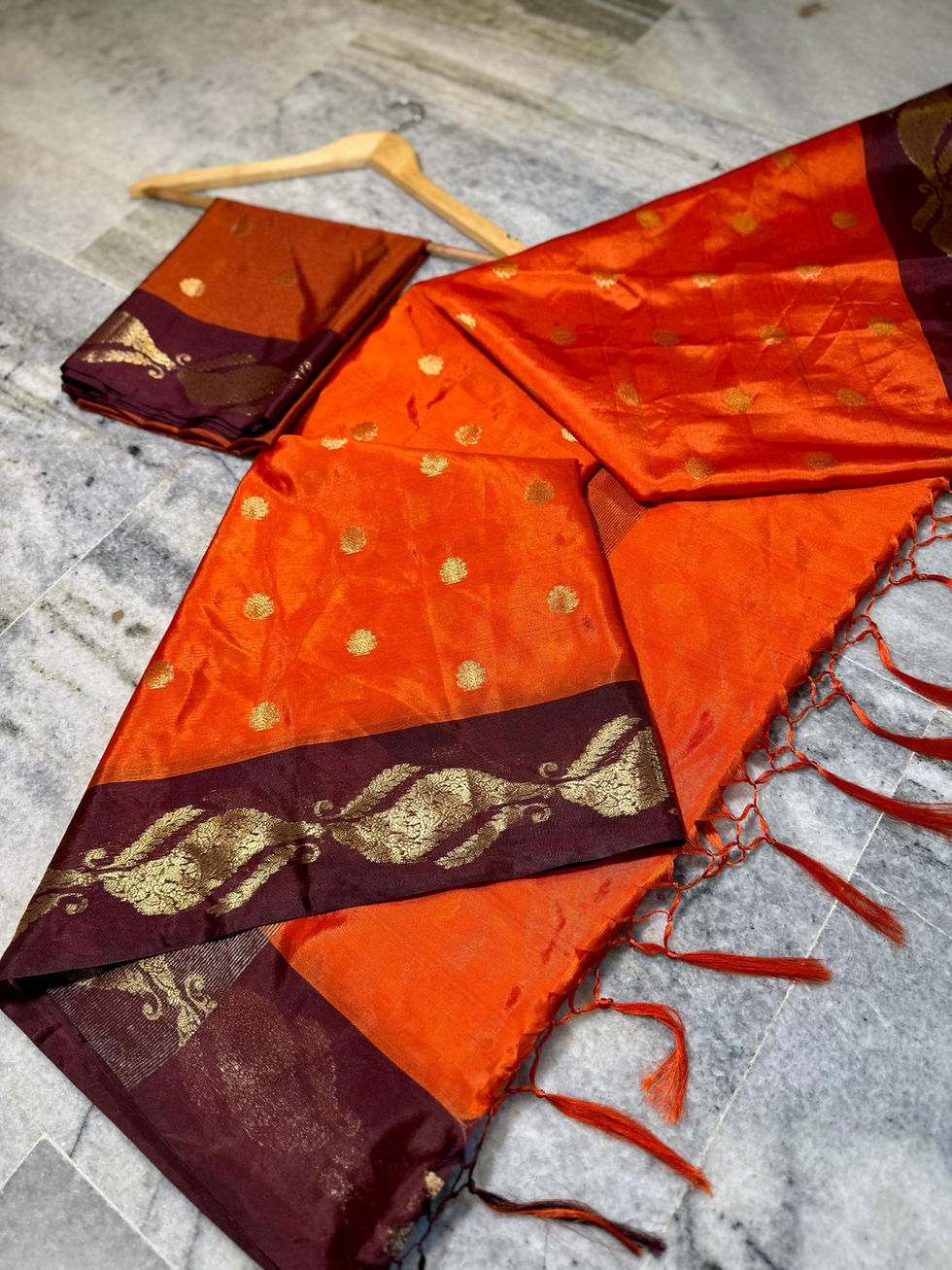 Elevate your festive and celebration wardrobe with this exquisite Banarasi tissue Silk saree. Crafted with a delicate blend of shimmering threads, the saree offers a perfect balance of tradition and contemporary charm. Its lightweight texture, glossy finish, and intricate weaving make it an ideal choice for weddings, parties, and special occasions.